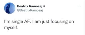 Beatrix është treguar e shpejtë në mohimin e aludimeve për një lidhje mes saj dhe Andit. Me anë të dy statuseve të publikuara në rrjetin social “Twitter”, Beatrix ka sqaruar se është beqare dhe për momentin po i dedikon kohë vetëm vetes.