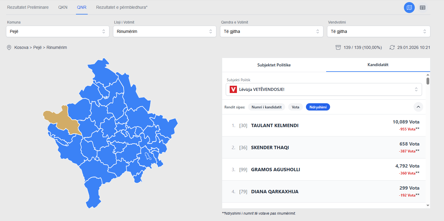 Kelmendi është kandidati me më së shumti vota të hequra pas rinumërimit në këtë komunë. Atij iu janë hequr 955 sosh.