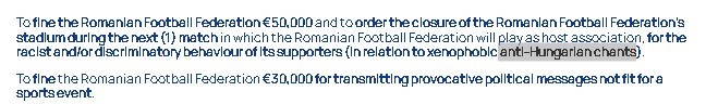 UEFA cilësoi si thirrje raciste, disa thirrje Anti-Hungari, për çka e dënoi Rumaninë me 50 mijë euro.