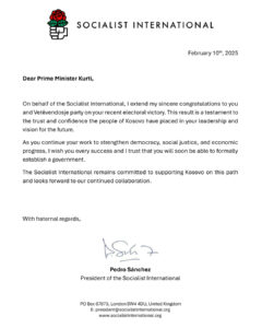 “Në emër të Internacionales Socialiste, dëshiroj t’ju përcjell urimet e mia më të sinqerta juve dhe Lëvizjes Vetëvendosje për fitoren tuaj të fundit zgjedhore. Ky rezultat është një dëshmi e besimit dhe mbështetjes që populli i Kosovës ka në udhëheqjen dhe vizionin tuaj për të ardhmen”, thuhet në urimi dërguar Kurtit.