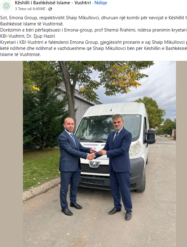 Kjo vërtetohet përmes një njoftimi të Këshillit të Bashkësisë Islame në Vushtrri të publikuar me 3 tetor 2024, ku Shemsi Rrahimi si përfaqësuesi i Emona Group i dhuron një furgon Këshillit të Bashkësisë Islame në Vushtrri në emër të Shaip Mikullovcit.