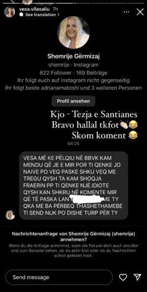 Ish-banorja e “Big Brother VIP Kosova”, Vesa Vllasaliu së fundmi ka publikuar në InstaStory disa mesazhe ofenduese të tezes së banores së shtëpisë së famshme, Santiana Maloku.