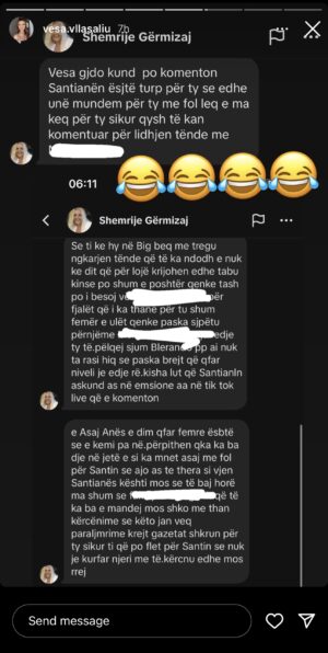 “Vesa më ke pëlqyer në ‘BBVK’ më je dukur e mirë por ti qenke jo naive por paske shkuar atje vetëm për të treguar se çfarë të ka bërë shoqja, ti qenke një idiote. Si kanë shkruar në komente mirë për ty? Ti përveç thashethemeve asgjë tjetër nuk dije të bëje.”- ka shkruar tezja e Santianës.