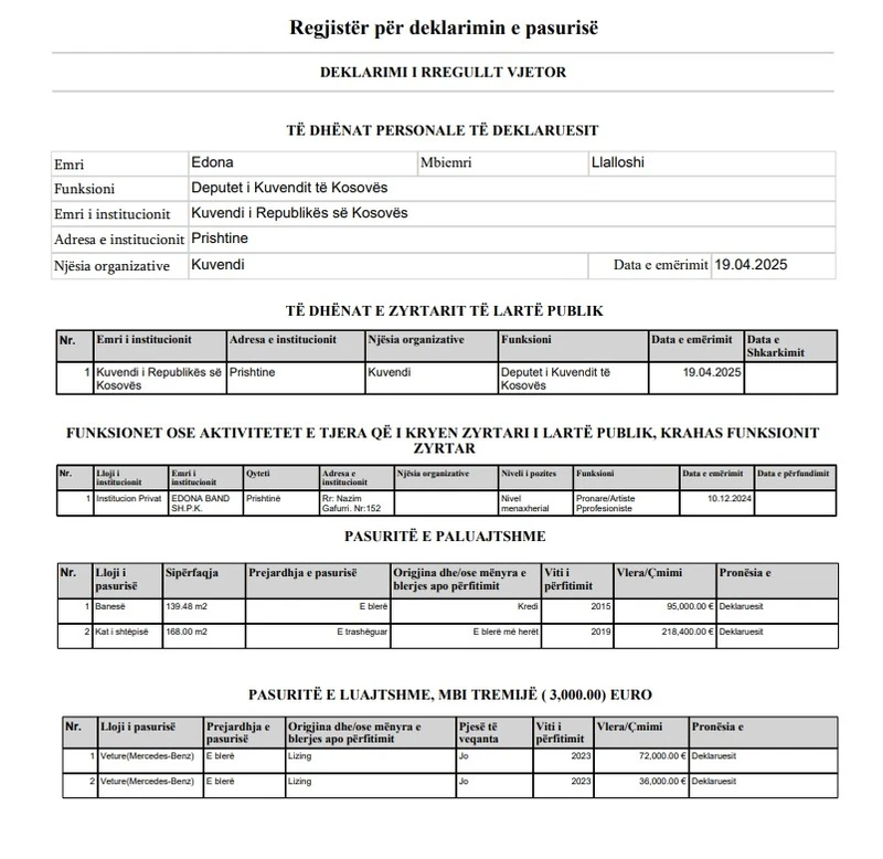 Këngëtarja dhe deputetja e Kuvendit të Kosovës, Edona Llalloshi, ka dorëzuar deklarimin e rregullt vjetor të pasurisë më 24 mars 2026, ndërsa si deputete është e emëruar që nga 19 prill 2025.