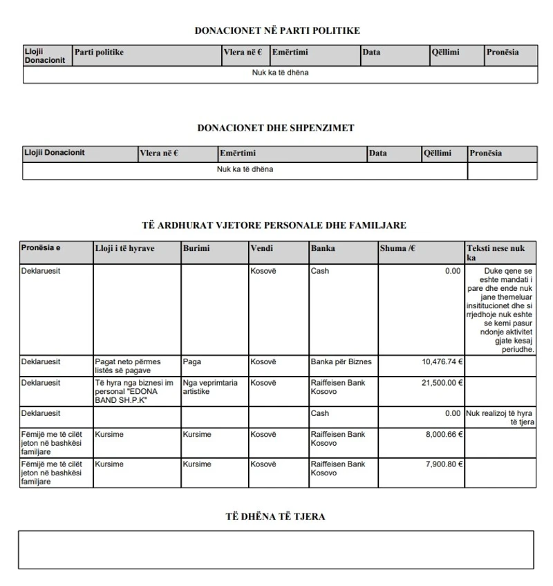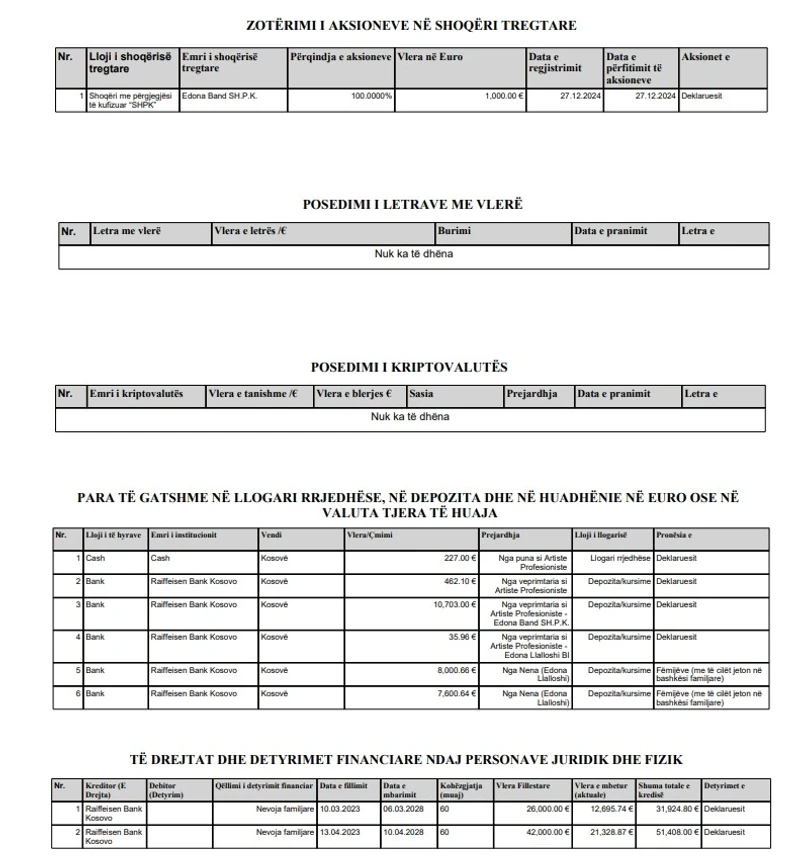 Deputetja dhe këngëtarja ka dorëzuar deklarimin vjetor më 24 mars 2026, ku figurojnë edhe kreditë në Raiffeisen, kursimet në bankë dhe të hyrat nga “Edona Band SH.P.K.”