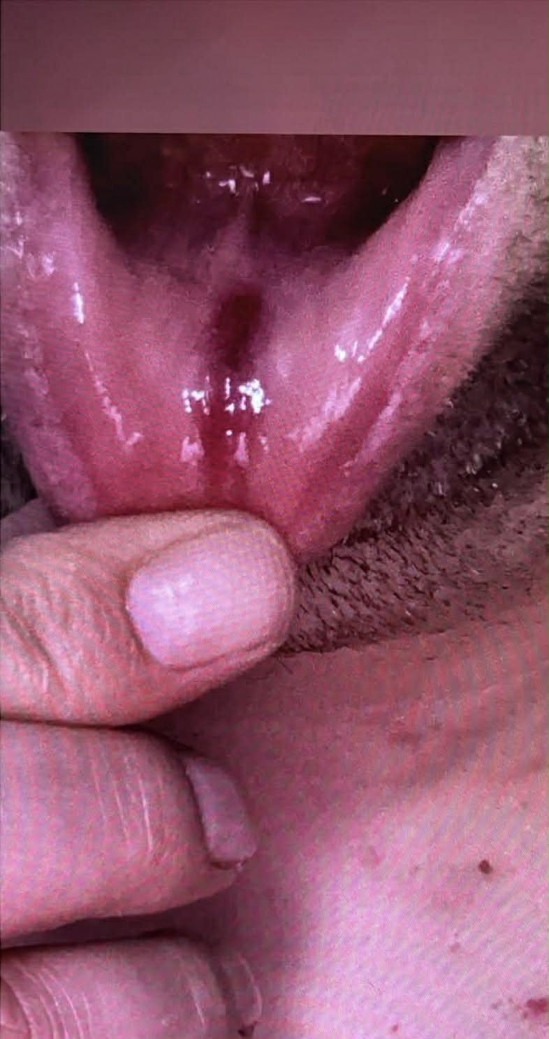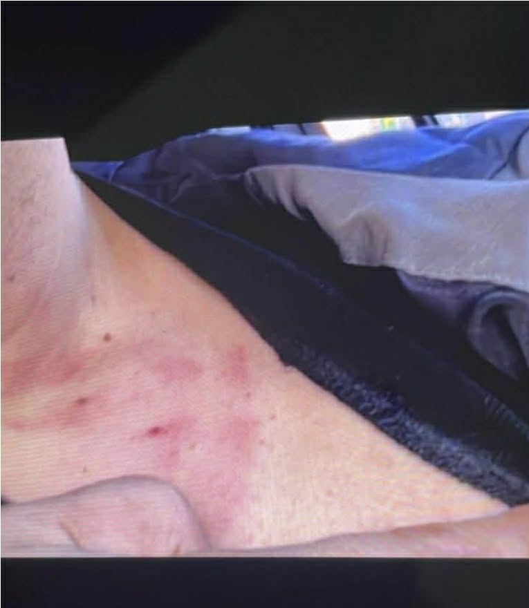 Në pjesën e brendshme të buzës së poshtme vërehet një plagë e hapur, ndërsa në zonën e qafës shihen skuqje dhe gërvishtje.