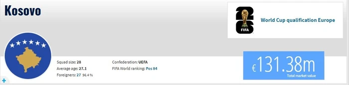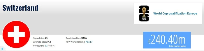Ekipi kombëtar i Kosovës ka një vlerë totale prej 131.38 milionë euro, ndërsa ai i Zvicrës ka një vlerë prej 240.40 milionë eurosh.