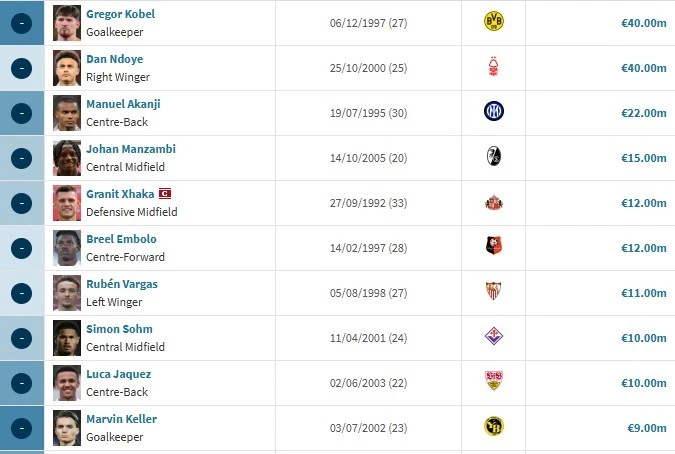 Helvetikët gjithashtu kanë emra tjerë të vlerë të lartë në treg si Manuel Akanji me 22 milionë euro, Johan Manzambi me vlerë 15 milionë euro dhe Granit Xhaka e Breel Embolo me nga 12 milionë euro.