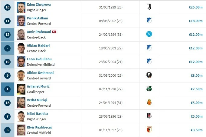 Në anën tjetër, te Kosova lojtari më vlerën më të lartë është Edon Zhegrova, i cili në treg vlerësohet me 25 milionë euro.
