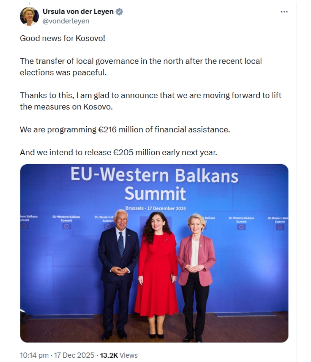 Presidentja e Komisionit Evropian, Ursula von der Leyen ka konfirmuar heqjen e masave ndaj Kosovës.