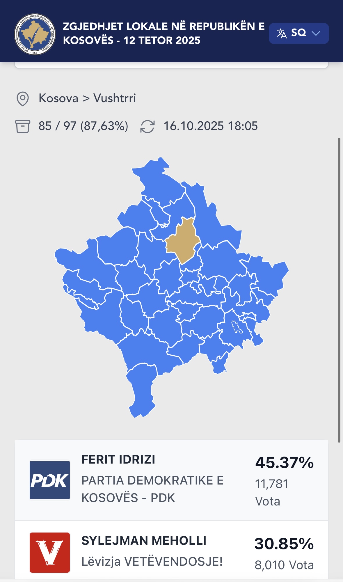 Bazuar në rezultatet e përditësuara të KQZ-së, kandidati i PDK-së në Vushtrri Ferit Idrizi prin me 45.37% të votave, pas tij vjen kandidati i LVV-së, Sylejman Meholli me 30.85%.
