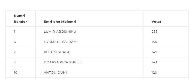 Nga Lidhja Demokratike e Kosovës, më i votuari është kandidati për kryeministër Lumir Abdixhiku me 255 vota, pasuar nga Hykmete Bajrami me 156 vota, Kujtim Shala me 149 vota, Doarsa Kicha-Xhelili me 143 vota dhe Anton Quni me 120 vota.