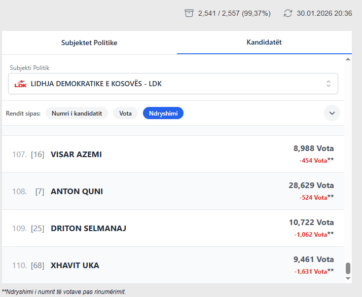 Më poshtë gjeni gjithë kandidatët e kësaj partie që u janë hequr mbi 100 vota nga rinumërimi: