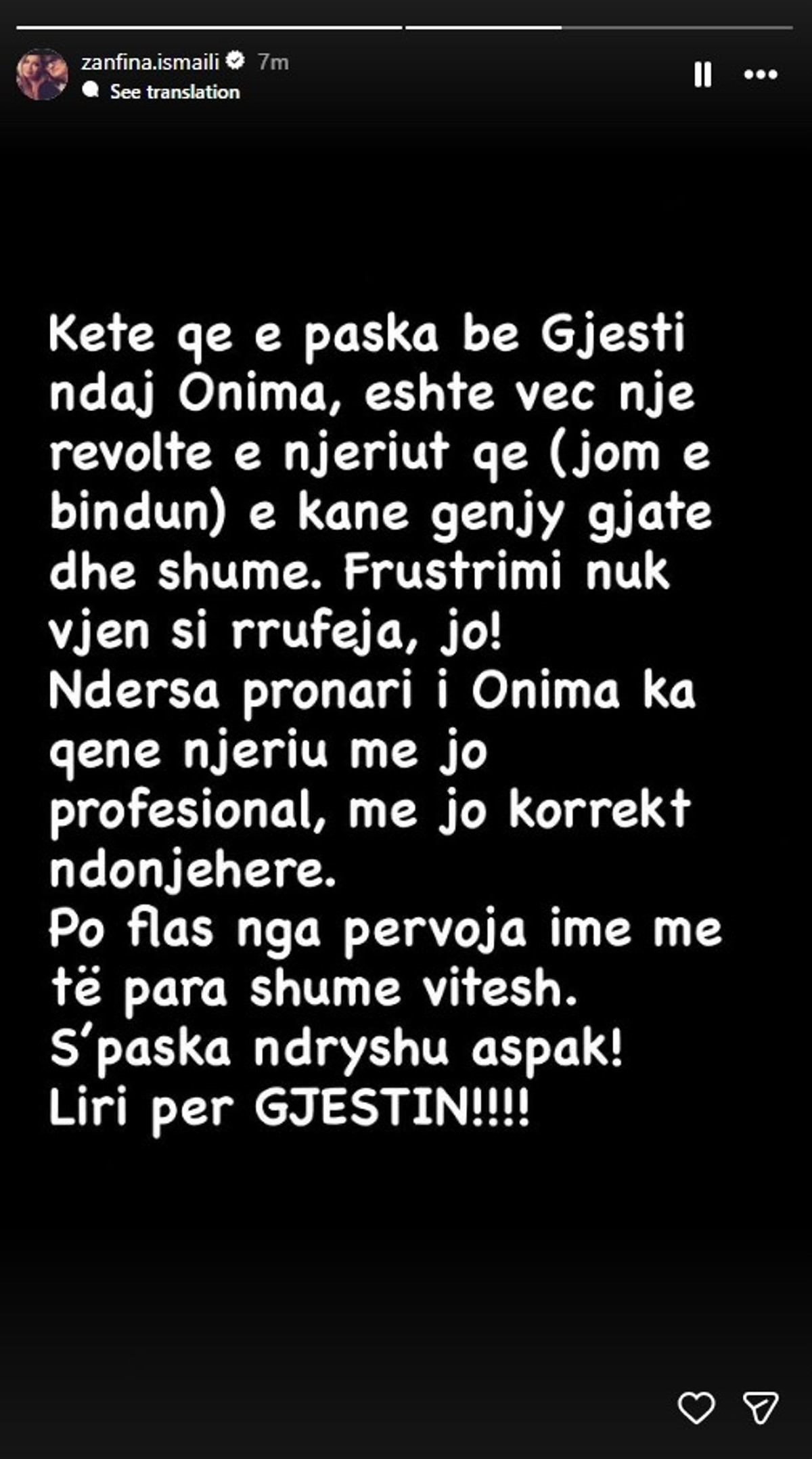 “Këtë që e paska bërë Gjesti ndaj Onima, është veç një revoltë e njeriut që (jam e bindur) e kanë gënjyer gjatë dhe shumë. Frustrimi nuk vjen si rrufeja, jo! Ndërsa pronari i Onima ka qenë njeriu më jo profesional, më jo korrekt ndonjëherë. Po flas nga përvoja ime para shumë vitesh. S’paska ndryshuar aspak! Liri për Gjestin”, ka shkruar Zanfina në InstaStory.