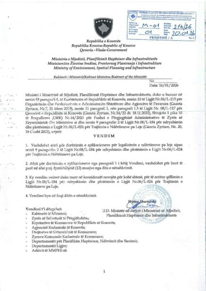 Ministria e Mjedisit, Planifikimit Hapësinor dhe Infrastrukturës (MMPHI) ka marrë vendim për vazhdimin e afatit për dorëzimin e aplikacioneve për legalizimin e ndërtimeve pa leje, në përputhje me nenin 9, paragrafi 2 të Ligjit Nr. 06/L-024 për Trajtimin e Ndërtimeve pa Leje.