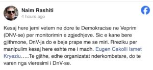 “Kësaj here jemi vetëm në dorë të Demokracisë në Veprim (DNV-së) për monitorimin e zgjedhjeve. Siç e kanë bërë gjithmonë, DnV-ja do e bëjë prapë më së miri. Rreziku për manipulim kësaj here është më i madh. Eugen Cakolli, Ismet Kryeziu….të gjithë, edhe organizatat ndërkombëtare, do të varen nga vlerësimi i DnV-së”, ka shkruar Rashiti.