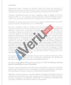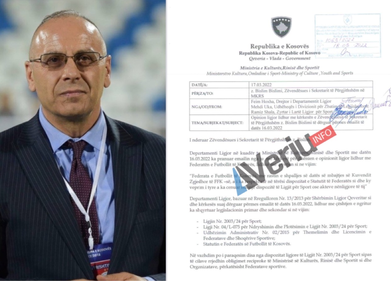 Zyra Ligjore e Ministrisë për Kulturë, Rini dhe Sport ka pranuar një kërkesë për opinion ligjor nga zëvendës-Sekretari i Përgjithshëm i MKRS-së, Bislim Bislimi, se me rastin e Shpalljes së mbajtjes së Kuvendit Zgjedhor të FFK-së “a janë respektuar në tërësi dispozitat e Statutit të FFK-së dhe se ky veprim a ka cenuar ndonjë dispozitë të Ligjit për Sport”, thuhet në dokumentin e siguruar nga Veriu.info.